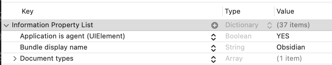 However, a community plugin called Global Hotkeys can take care of some of this, but only if Obsidian is already running, and it still always shows it in the dock. With some smart adjustments to the Info.plist file and automatic startup, we can get really far though. I got the inspiration from this blog.